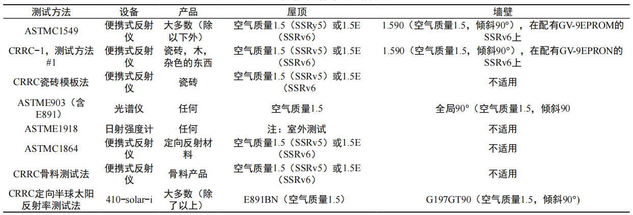測試太陽(yáng)反射率的方法有多種,包括美國建筑標準協(xié)會(huì )(ASTM)的測試方法以及美國涼爽屋頂評級委員會(huì )(CRRC)的測試方法。表1 列出了各種產(chǎn)品的使用方法。