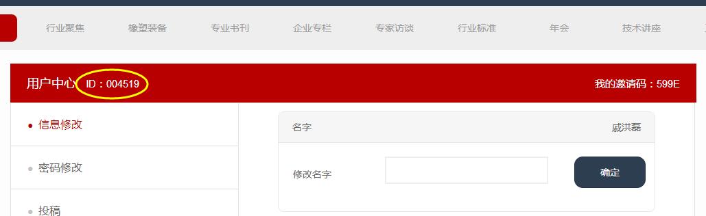 請注意,全國橡塑機械信息中心、石油和化工橡塑節能環(huán)保中心成員單位員工均可獲得全年4本收費期刊的全年免費閱讀權限(成員單位員工個(gè)人用戶(hù)ID號,將由貴公司信息員統一上報至中心)。除此之外如若您有如下身份:全國橡膠塑料技術(shù)專(zhuān)家委員會(huì )專(zhuān)家、全國橡膠塑料設計技術(shù)中心技術(shù)委員、《橡塑技術(shù)與裝備》編委或通訊員、紙刊廣告聯(lián)系人,請您注冊后將您的用戶(hù)ID號(APP端在“用戶(hù)中心”-“個(gè)人資料”中,網(wǎng)站端在“用戶(hù)中心”旁邊的ID號就是,如下圖)告訴我們,以便為您開(kāi)通相關(guān)收費期刊的整本免費閱讀權限。